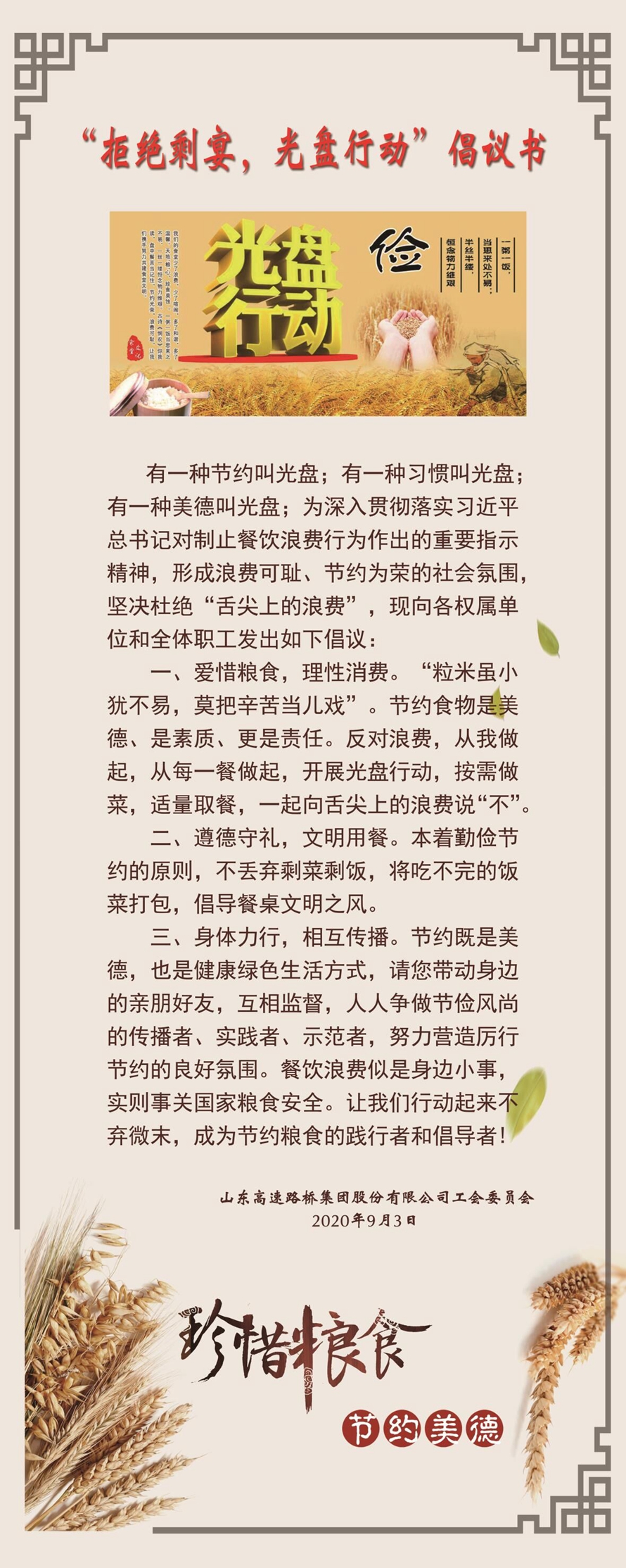 為貫徹落實(shí)習(xí)近平總書(shū)記制止餐飲浪費(fèi)的指示精神,路橋股份全體職工誓將“厲行勤儉節(jié)約,反對(duì)鋪張浪費(fèi)”的倡議深入開(kāi)展。
